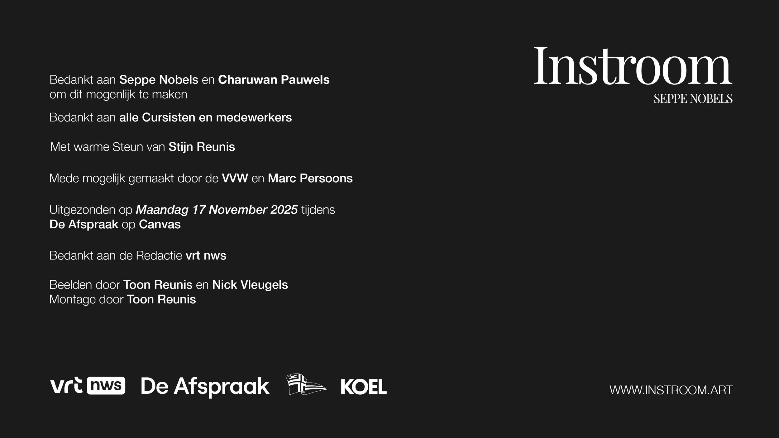 Nieuw project door Instroom met Charuwan Pauwels en Seppe Nobels te ontdekken op het terrein Linkeroever van VVW/Een project met maatschappelijke waarde. Bedankt aan de cursisten om hun gevoel te delen. Beelden door Nick Vleugels en Toon Reunis, maandag 17 November 2025 op De Afspraak gekomen op Canvas gehost door Fatma Tasoubar. Met warme steun van Stijn Reunis. Speciale Bedanking aan Marc Persoons. Extra thanks to Samantha Yancey for the end card.